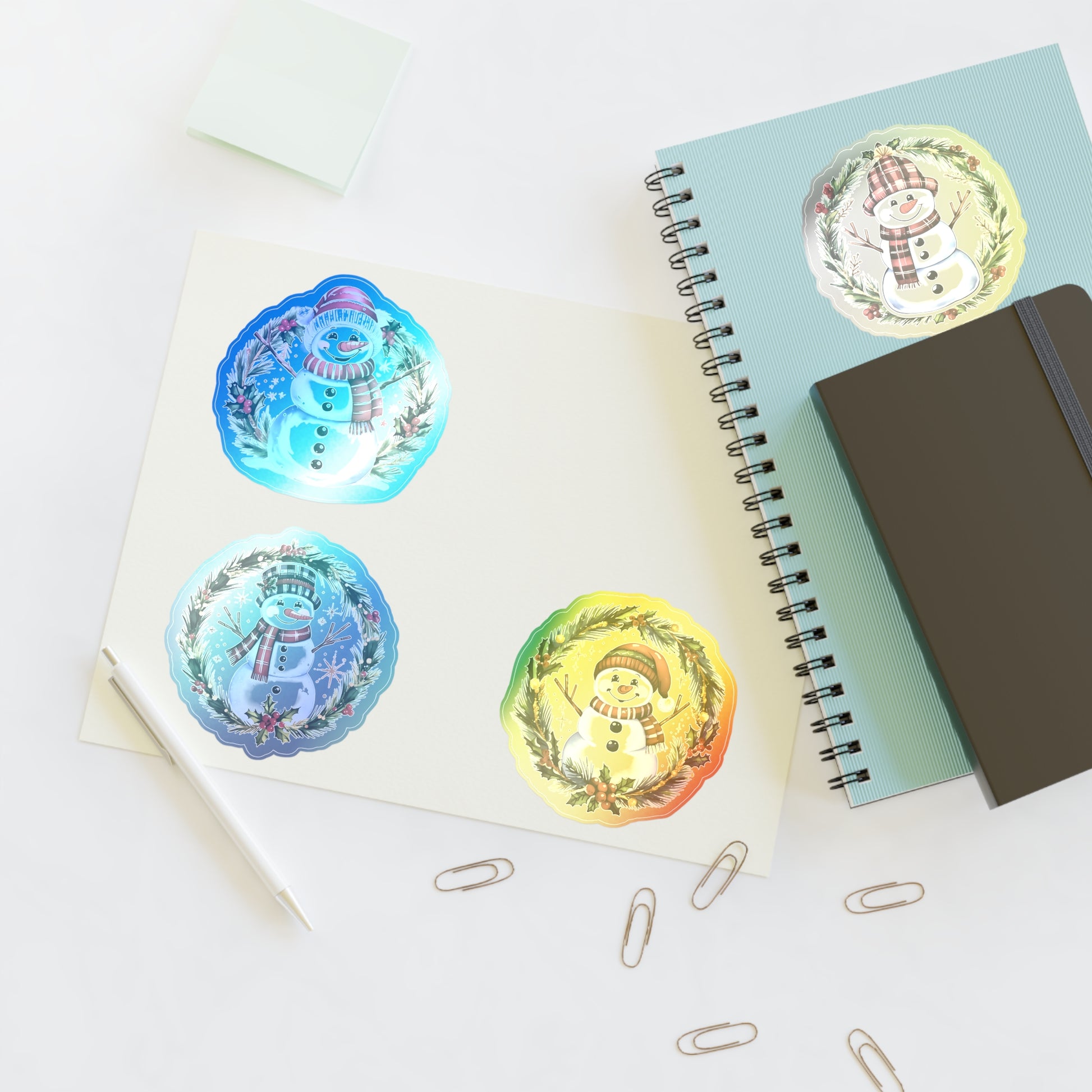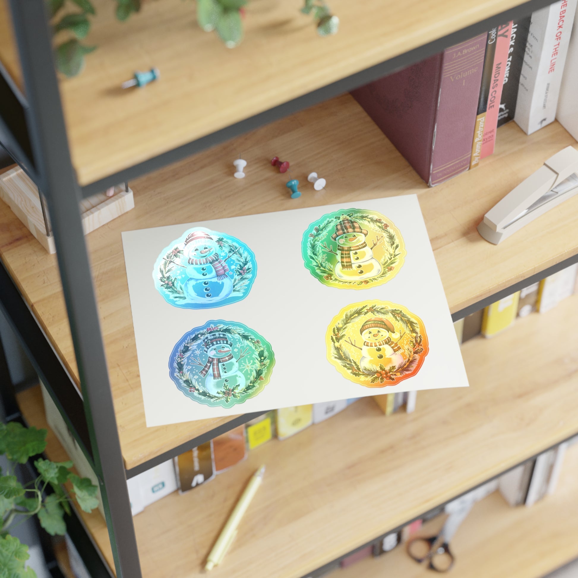 Four Snowman Sticker Set, Winter Holiday Decals, Christmas Snowmen Vinyl Stickers, Wreath Art For Laptop, Planner, Scrapbook, Mug,Journal