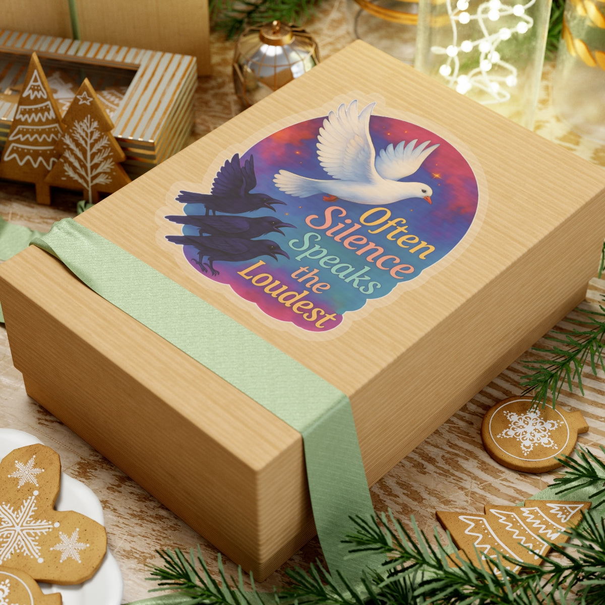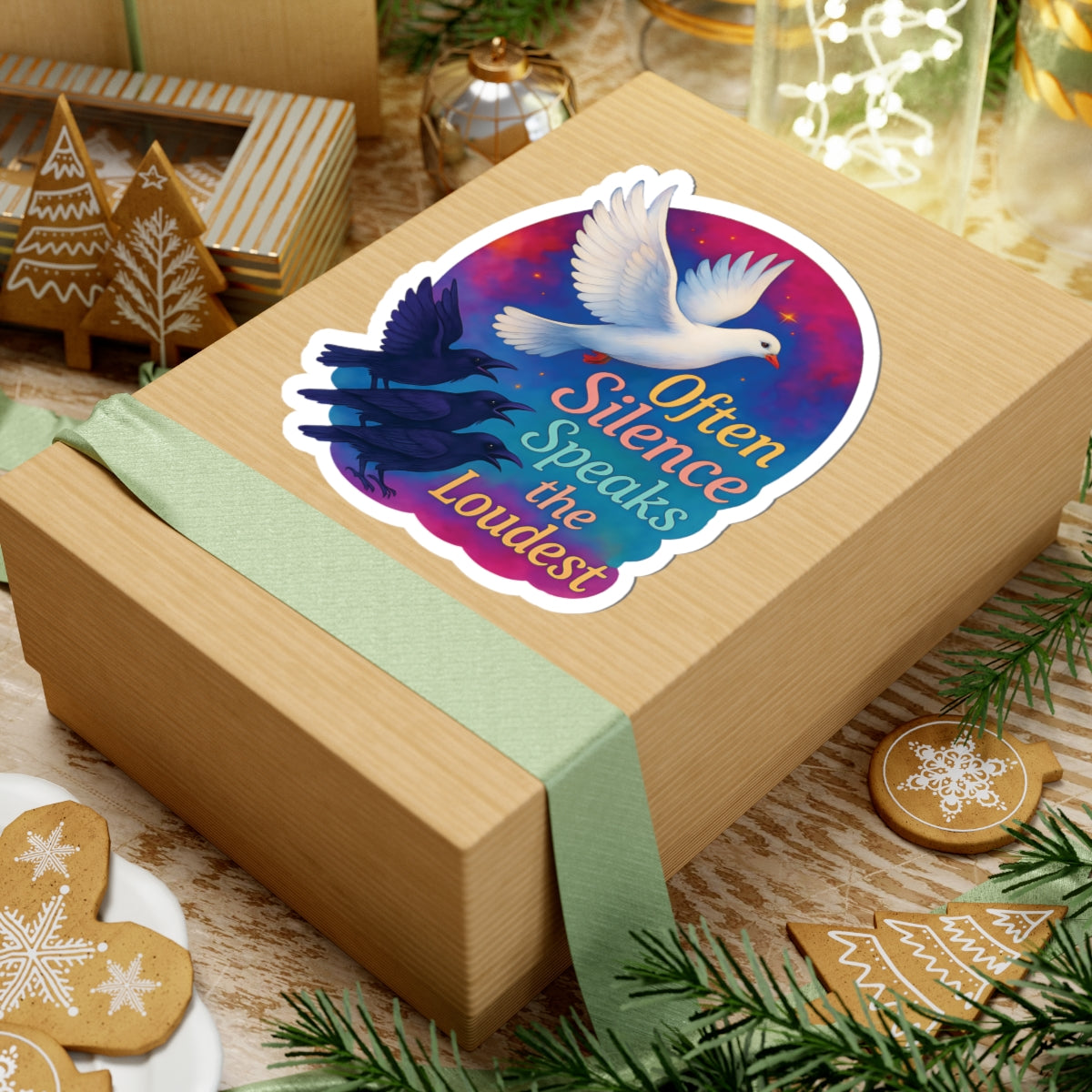 🕊️✨ Let your silence speak volumes with this stunning kiss-cut vinyl sticker featuring a graceful white dove rising above noisy crows, set against a vibrant sky bursting with deep color gradients and golden stars. The powerful message — “Often Silence Speaks the Loudest” — is elegantly displayed in soft, flowing font beneath the scene.